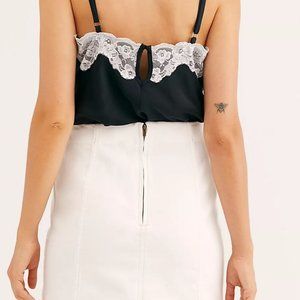 Free people Denim mini skirt in a super stretchy fit with exposed seam detailing. Zip closure in back. Color is called "Stark white." Retails for $50. Size 0. Small faint stain on front.