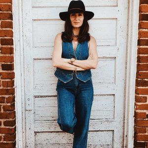 A contemporary twist to a vintage-inspired classic, this timeless denim suit is featured in an authentic rigid fabrication with button-front vest and matching high-rise, flare jeans for timeless style from season to season.