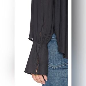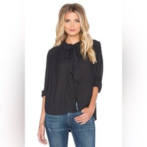 Darling black blouse from Free People with fabric-covered buttons down the front and a neck tie. Can be worn buttoned up and more conservative or wide open, as shown. :) In good preowned condition; no visible flaws. Size XS.