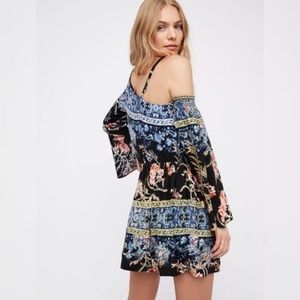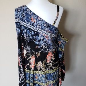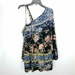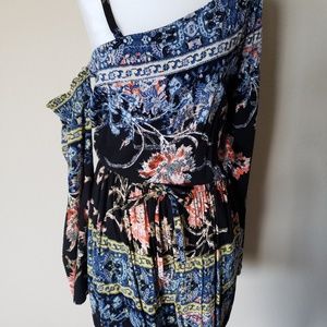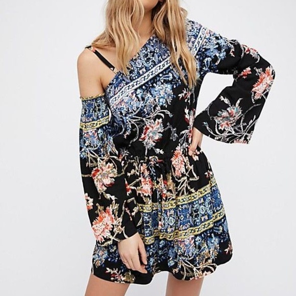 A black, one-shoulder mini dress with bell sleeves and a multicolored paisley pattern. The top of the right sleeve has a shirred elastic hem to grip the upper arm. Comes with a detachable right shoulder strap and an elastic waistband with a tie at the waist.
