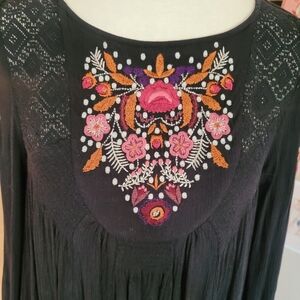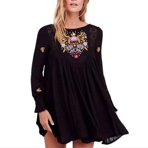 Excellent pre owned condition. Free People Mohave Black Gauze Swing Dress. Look totally boho-chic in this long-sleeve mini dress from Free People, energized with colorful embroidery.