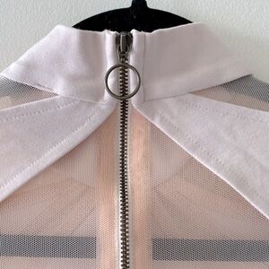 Reign supreme in the Free People Monarch White Mesh Long Sleeve Top! Lightweight, stretch knit falls from a mock neck, into a fit and flare bodice framed by long sleeves. Unique mesh detailing across back, sleeves, and bodice finishes the look. Exposed gold back zipper.