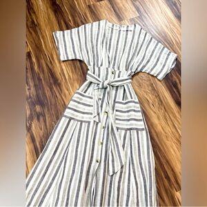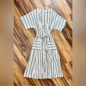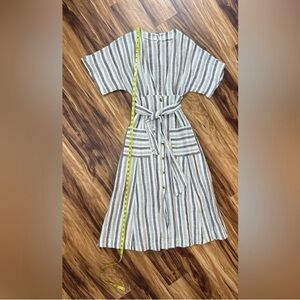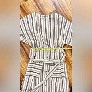 Elevate your style with this chic striped linen midi dress. Featuring a flattering tie waist and button-down front, it's perfect for any occasion. The neutral tones make it versatile and easy to pair with your favorite accessories.
