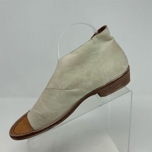Keywords: Free People sandals, women's slip on sandals, white cream leather sandals, asymmetrical design shoes, embossed leather detailing, slip-on sandals, Mont Blanc sandals, low heel sandals, casual spring footwear, Spanish-made sandals, size 10 women's shoes, EU size 40 sandals, leather insole sandals, leather outsole sandals, women's casual sandals.