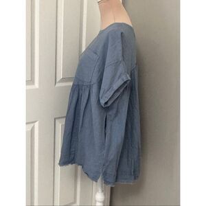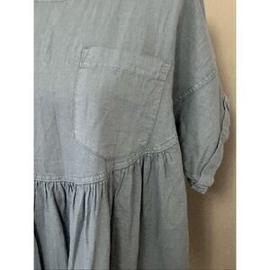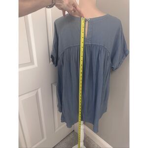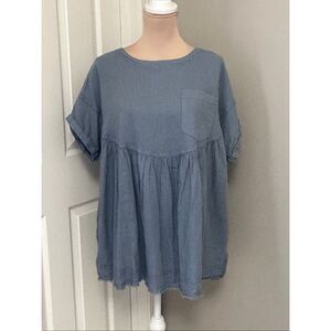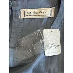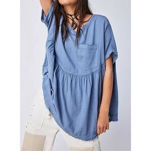 Free People/ We the Free Moon City Tunic Top in size small. NWT!! Beautiful flattering blue color. Cuffed short sleeves, gathered bodice, scoop neckline, babydoll silhouette, front patch pocket. Oversized fit. Cute detail throughout. Originally $88.