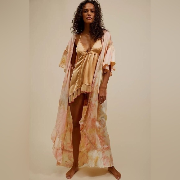 Luxurious satin robe set by Free People. Features a gold camisole and shorts with a flowing pink robe. Perfect for stylish comfort.