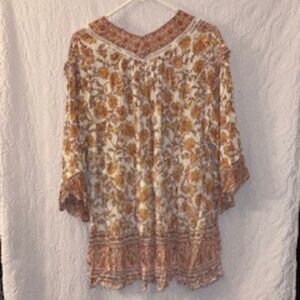 Boho style shirt. Side pockets. Ruffle detail at shoulders. Dropped shoulders. 3/4 flounce sleeves. Peplum ruffle hem. V-neckline with self tie.