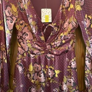 Gorgeous and elegant, this floral, polka dot dress by Free People has a silky, soft hand. Very flowy. Long puffed blouson sleeves, smocked wrists and waist. It also features a v-neck with keyhole and tie at the front chest. Partial side zip. Fully lined. Brand new without tags.