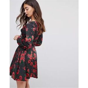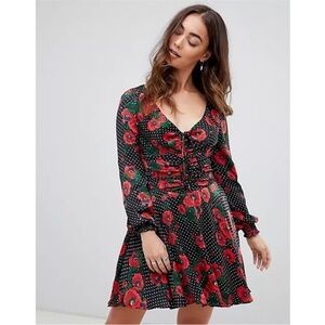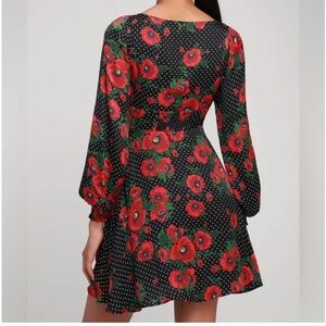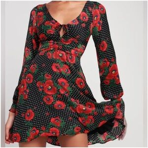 **Keywords:** Free People dress, floral mini dress, boho chic dress, size 8 Free People, EUC Free People, long sleeve dress, polka dot floral dress, red poppy print, festival fashion, fall transition dress.
