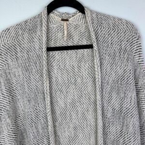 Free People Motions Cardi. This lightweight cotton blend open front cardigan features a related fit and dolman style long sleeves. Color is a woven black, cream, and grey mixture. Reverse braided hem detail gives this sweater bohemian flare. Comfy, soft, and drapey jacket perfect for chilly summer nights. Excellent condition. Women's size S small, measurements pictured.