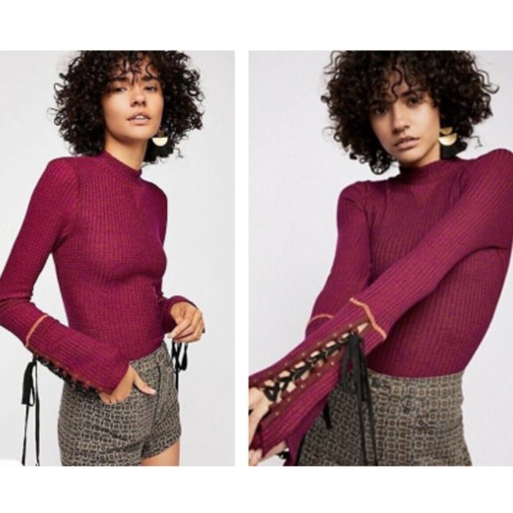 NWOT Free People Mountaineer in Wine Lace-up Cuff Mock Neck Knit Top L.
