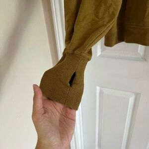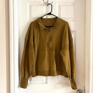 color is Alchemy, golden brown. The perfect pop-on pullover featured in a collared, quarter-zip style with a front pouch pocket, dropped dolman sleeves, and an easy relaxed fit. Thumbhole cuffs