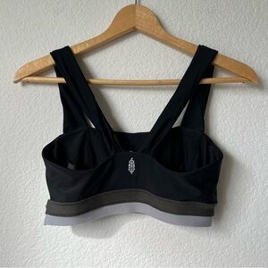 Black sports bra from Free People Movement. Green and gray stripe band. Pullover style. Size medium. Excellent pre-owned condition.