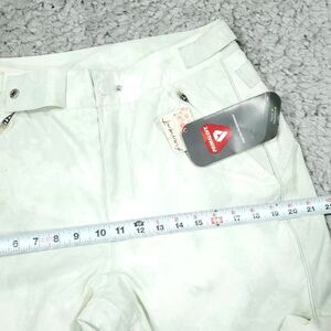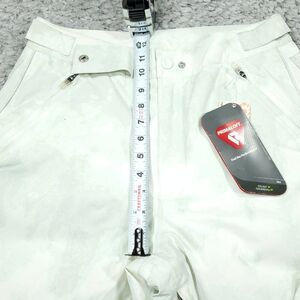 Women's Free People Movement Bunny Slope printed ski pants or snow pants in light green "Mountain mist sage combo". New with tags, but has some light dirt and marks on the back and leg openings from being in a retail environment. Women's size medium, real measurements shown in photos with pants laid flat: Waist approx 15.25", Hip approx 21.5", Rise approx 11.5", Inseam approx 30"
