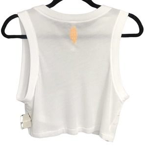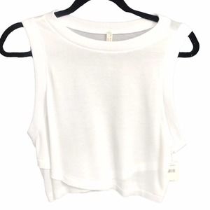 A wrapped-look front and an embroidery detail at the back soften this cropped style cut with muscle tank-inspired armholes and a no-nonsense crewneck.