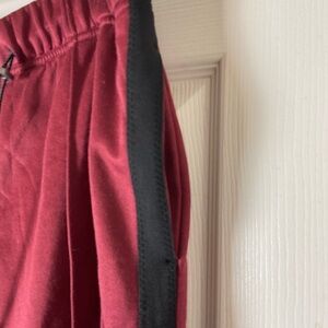 Soft, smooth fabrication; subtle shine finish; contrast piping detail down side leg; elasticated waistband