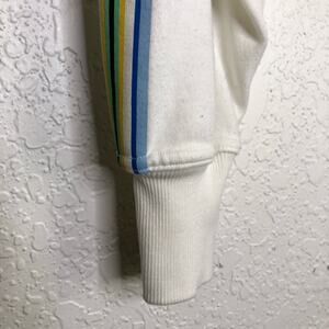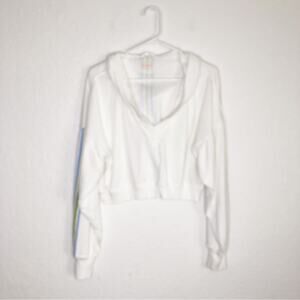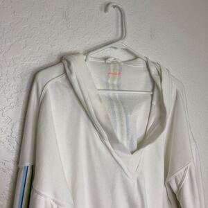 Free People Movement Grand Slam white striped athletic hooded sweatshirt. White with blue yellow green stripes. Pullover style with v neckline. Hooded in back. Cropped style. Ribbed sleeve cuffs. Size Extra Small XS. Excellent preowned condition. Minor wash wear. Matching shorts listed separately in closet / store.