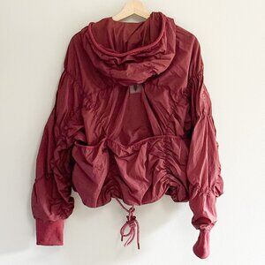 Features: Lightweight, breathable grid-like fabrication; wind- and water-resistant finish; fully lined sweat-wicking mesh; underarm and back body ventilation; hood rolls down and secures in place; zippered hand pockets; large back storage pocket with separate storage compartments; draw cord adjustable hood; adjustable bottom hem; packable hood; ribbed cuff detail. Ruched femme detail meets trail-ready tech for your next hike.
