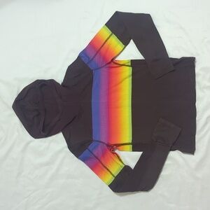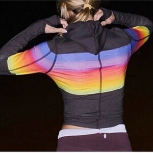 Features: Soft printed fabrication, high-neckline with hood, contrast-colored seams throughout, side-slit detail at hemline, thumbholes at both wrists