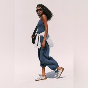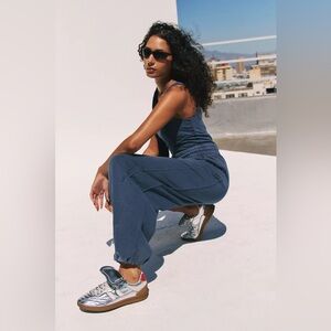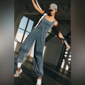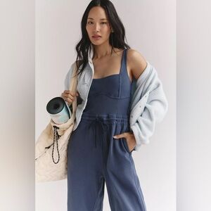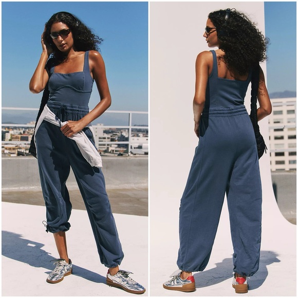 Features: Soft fabrication with stretchy feel; square neckline and detailed bust seaming; large side pockets; ruching around the knee; elastic ankle cuffs; straight-leg bottom; adjustable drawstring waistband
