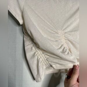 Free People Movement Ivory White Short Sleeve Crop Top. Lightweight and semi sheer. Cap sleeve, round neck crop top. Ruched center. No size/One Size. Fits a Small/Medium.