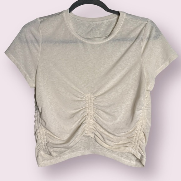 Free People Movement Ivory White Short Sleeve Crop Top. Lightweight and semi sheer. Cap sleeve, round neck crop top. Ruched center. No size/One Size. Fits a Small/Medium.