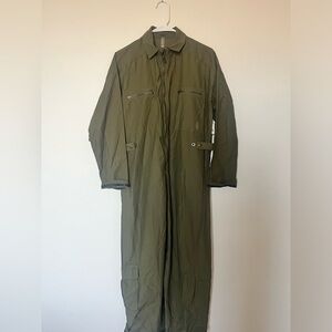 Features: Jumpsuit style; cargo leg and chest pockets; cinched wrist and ankle hems; relaxed silhouette.