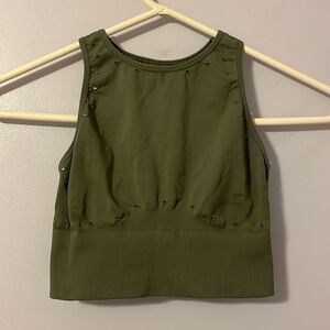 Free People Movement Olive Green High Neck Sports Bra Crop Top size XS/S. Good preowned condition. Has distressed holes ventilation all over part of design. Different textures to fabric in different areas. Stretchy. See pictures for approximate measurements.