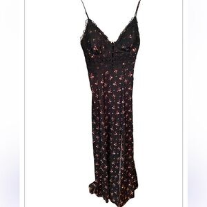 So pretty floral print slip dress featured in an A-line maxi length with a slit skirt, button-up neckline and crochet lace detailing.