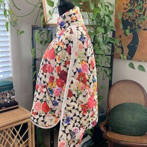Off white with multicolor floral and geometric pattern. Long sleeve. Zip up. Has pockets. 100% polyamide. Size XS. Excellent used condition - no rips, tears, or stains. Flat lay measurements are approximate.