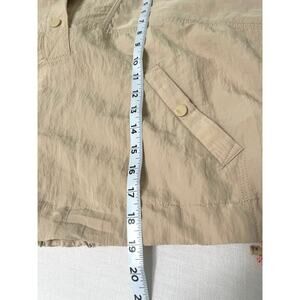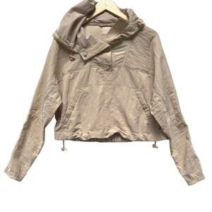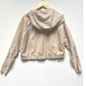 Details: size XS, Lightweight and so essential, this long-sleeve pullover is featured in a crinkle-inspired fabrication and cropped fit with a hooded neckline and button-front neckline, adjustable bungee cords and mesh lining, snap-button pockets for hands, cinched bottom hem with adjustable bungee cords, seam detail throughout
