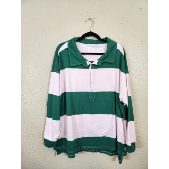 Keywords: Free People Movement, Rugby Shirt, Striped Top, Long Sleeve, Pullover, Casual Shirt, Sporty, Athleisure, Green and Pink, Collared Shirt, Relaxed Fit, Womens Top
