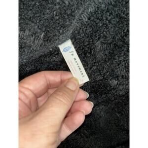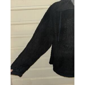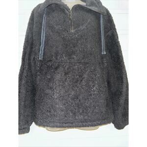 Free People Movement solid black sherpa fleece long sleeve 1/4 zip pullover sweatshirt. Features large fold down or stand up collar with black drawstring detail and 1/4 length plastic zip closure at center front. Zipper extends into collar. Drop shoulder seams. Long loose fit sleeves with elastic stretch cuffs at ends. Open-sided pouch style pocket at low center front. Cut loose and straight through body length, falling to high hip. Heavier weight soft sherpa fleece fabric with stretch available. Women’s size large with a relaxed fit. 54” unstretched bust measurement and 23.5” length from shoulder top to bottom hem. EUC. Wind a few times. Recently cleaned and spotless