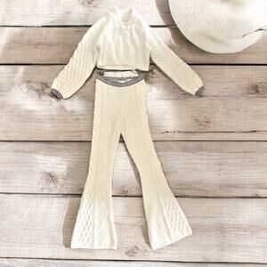 Ultra cozy in a cable knit, this perfect set takes you from the slopes to lounging about with an ultra-soft, high-neck pullover and coordinating pull-on flares.
