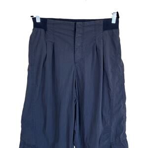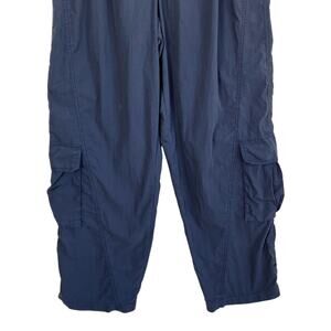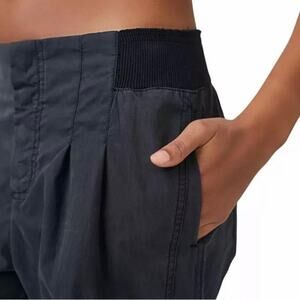 Lightweight nylon fabrication, stretchy elastic waistband with ribbed knit detailing, oversized pockets, cargo-inspired pocket at leg, pleated detail, snap-button detail at bottom of legs