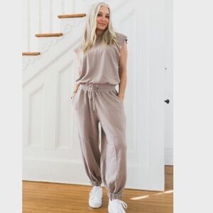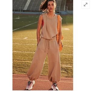 This comfortable and versatile onesie is designed for post-workout lounging or casual wear. It features a relaxed fit with billowy, ankle-length legs in a soft terry fabrication. The design also includes a crew neckline, dropped armholes, cinched waist with an adjustable drawstring, pockets, and a back cutout with a snap-button closure. Size small but fits very oversized. Good condition except for some rust to fabric from drawstrings.
