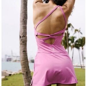 Your favorite one-shoulder onesie is now featured in an ultra-flattering skort silhouette with built-in performance shorts and a bold side cutout.