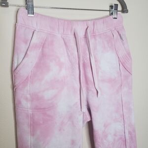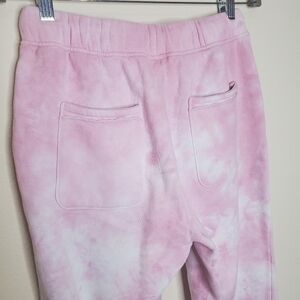 Excellent condition. Pink & White. Tie dye print. Drawstring to adjust waist. Jogger/Tapered leg. Four pockets. Fleece lined. Relaxed fit. No pilling.