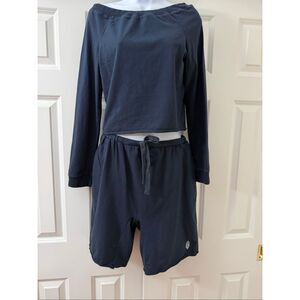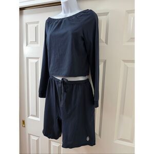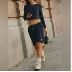 Effortlessly elevate your workout wardrobe rotation with this super cool set featuring an off-the-shoulder long-sleeve top with coordinating longline shorts for the perfect done-in-one look no matter the activity.