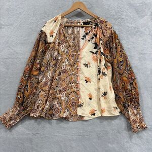 Stylish button down shirt. Features a mix of floral and paisley patterns. Voluminous sleeves add flair.