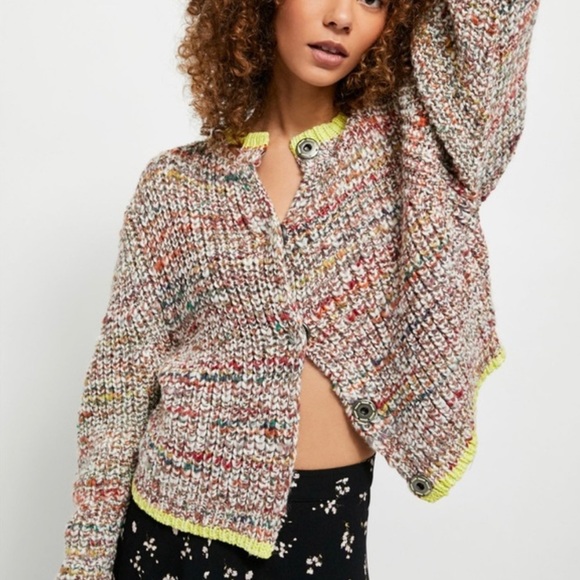 free people multicolor chunky knit cardigan size large neon trim, free people slouchy cardigan wool blend boho sweater fall winter cozy layering, free people knit cardigan oversized colorful sweater, free people neon trim cardigan boho fall layering cozy knit
