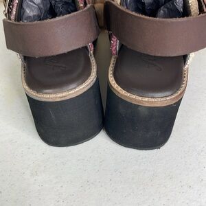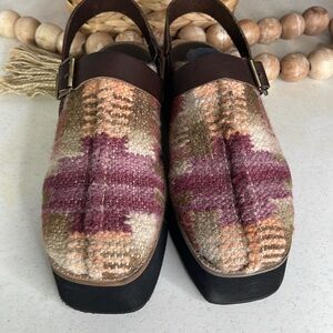 Stylish platform mules with a multicolor woven design. Features adjustable brown straps and a sturdy black sole.