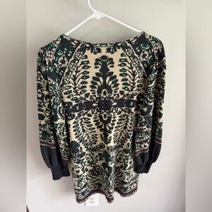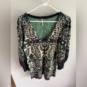 Really pretty long puff deep v-neck sleeve sweater mini dress by Free People! Very intricate bohemian design in cream/green/blue/black. Gorgeous + soft sweater dress!