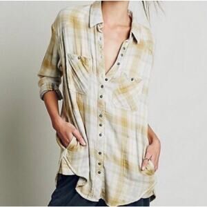 Free People Mustard Yellow Flannel Double Dip Button Down Oversized Shirt. Very soft material with some stretch. Side pockets.