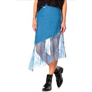 Free People ✦ My Lacey Velvet Midi Skirt ✦ Blue Asymmetrical Lace Hem Side Zip