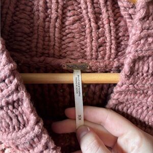 Free People “My Only Sunshine” mock neck chunky knit sweater in a beautiful dark pink color. Size M. Some wear to the knit as seen in photos but it’s SUPER comfortable and soft!
