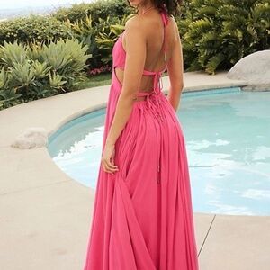 Made with our sheer and gauzy free-est fabric, this flowy and effortless maxi dress featuring a halter neckline with adjustable ties at the back creating skin baring cutout details. Layered design with dramatic slits.