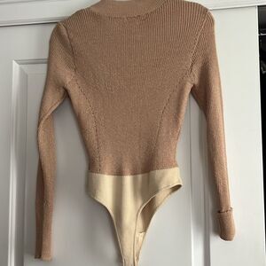 Free People subtle shine bodysuit. Condition: New with tags Approximate measurements taken lying flat: P2P: 15”-21”+ Length to waist unstretched 17.5” Super pretty metallic knit ribbed body shirt. Has golden flecks in it . Hygiene liner still remains NWT, New with Tags, Gift, present, teen, teenager, holiday, Xmas, Christmas, Hanukkah, dressy, office party, modest, coverage,