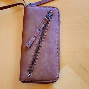 It is a beautiful soft brown leather wristlet wallet with a zipper close and an interior zipper pocket. There is also a pocket for cash as well as 6 card slots. It has an attached wrist strap so you can carry it on its own or throw it in your handbag. Super versatile!
