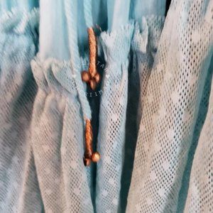 This is a beautiful, striking pastel blue. Reminds me of a Robin egg. This dress is adjustable at the neck, waist, and bust, and has bells on the strings.